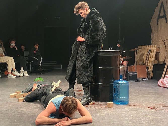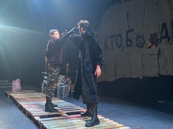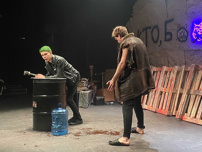 А на другом конце провода были Дейви, в исполнении Макара Карягина, - зелёноволосый персонаж, у которого состояние паники периодически сменяется нервным спокойствием и безразличием, и его подельник по перекрашиванию рыжего кота гуталином Донни в исполнении Никиты Биндерс. Комичность поступков героев усиливается с каждой секундой, очередное абсурдное решение кажется вполне закономерным, а очередной труп - прекрасным дополнением к таким декорациям, как окровавленные деревянные подставки. Эти деревянные подставки под грузы, а также бочку перемещали по сцене люди в черных балаклавах под музыкальные композиции ударника. Какую бы роль ни выполняли эти декорации, создавалась атмосфера места пытки, искусственной и оттого комичной жестокости. Ударная установка играла важную роль в создании атмосферы, вовремя исполненные звуки или небольшие мелодии имели тот же эффект, что и ненормативная лексика, они передавали эмоциональное состояние говорящего и заостряли внимание на определенных словах и угрозах.