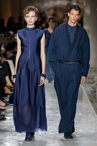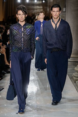 Сама коллекция стала блестящей ретроспективой, воплотившей в себе философию Армани. На подиуме ожили его ключевые стилистические открытия: элегантная трансформация мужского костюма для женщины, выраженная в мягких приталенных пиджаках и брюках с высокой талией, струящиеся пальто с женственными силуэтами и тонкие полупрозрачные блузы, которые он предпочитал грубым тканям. Путешествие по фирменной палитре — от сдержанных серо-бежевых тонов до насыщенного Armani Blue и поздних экспериментов с изумрудом и фиолетом — наглядно демонстрировало эволюцию его вкуса. Доминирующие в коллекции брюки из струящихся тканей и сияющие вечерние платья с пайетками равно доказывали верность принципу универсальности и вневременной элегантности, отвергающей сиюминутные тренды.