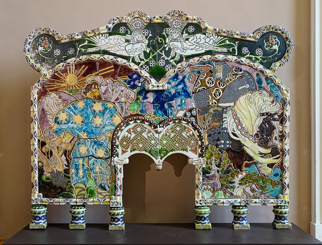 Михаил Врубель изготавливал панно камина, вазы, кашпо и декоративные блюда с помощью майолики. Отец Михаила Врубеля даже называл сына «художником по печной части» в одном из писем. В этих работах проявляются черты модерна, что заметно и на его живописных полотнах.