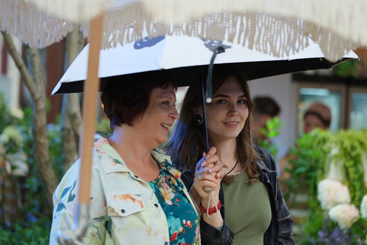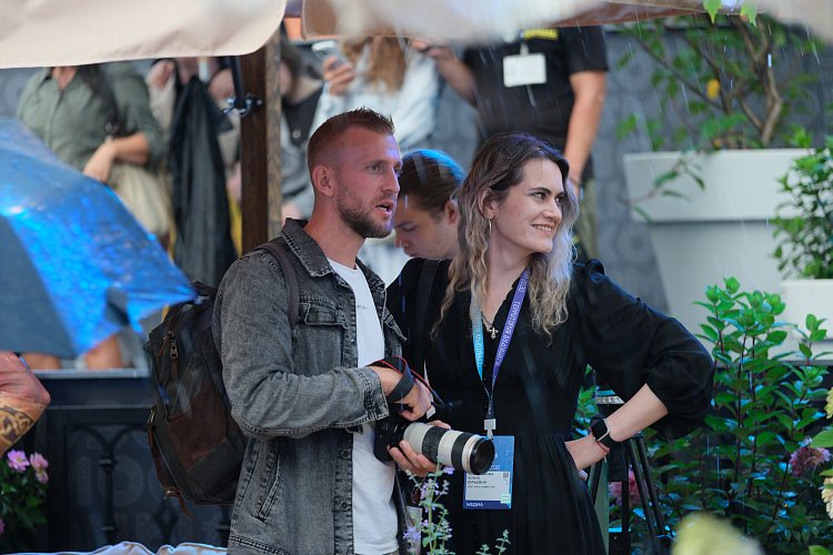 Дождь не омрачил модный показ, большинство гостей вооружились собственными зонтами, либо укрылись в под зонтики за столиками в лаундж зоне.