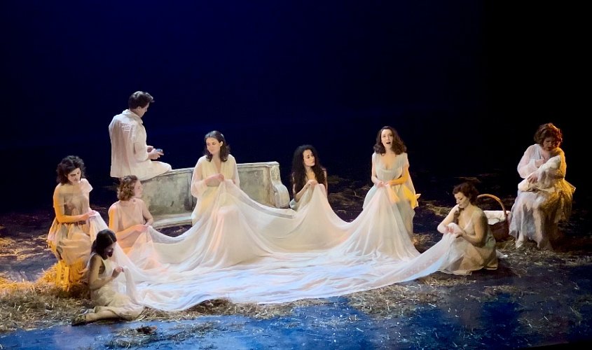 Занавес открывается, и начинается постановка… Ах, да, занавес — это железные ворота в мир чумной Флоренции. Трое юношей и семь дам решают сбежать из умирающего города. Однако, когда на сцене появляются девушки, становится не по себе, ведь режиссёр решил внести изменения в оригинальное произведение. Теперь их девять, и это число кажется символичным. Три и девять, девять и три — божественные числа, как у Данте в «Божественной комедии». Автор спектакля словно даёт надежду своим героям на лучшее, на то, что они смогут спастись от проклятой болезни.