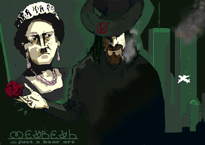 Что же на самом деле взорвал Гай Фокс? Разве парламент?! Нет: он взорвал весь «символ» колониальной «демократической» системы и её устремления к мировому господству. И тут зрителю во всей красе является полный набор сарказма: взрыв суда, наивная молоденькая служащая с телевидения (блестящая Натали Портман) и тёплый привет советской революции 1918 года, в виде звуков самого известного музыкального произведения в мире - увертюры Чайковского «1812», под звуки которой проходит страшная аналогия с так скоро позабытым гитлеровским режимом и крушением башен-близнецов.
