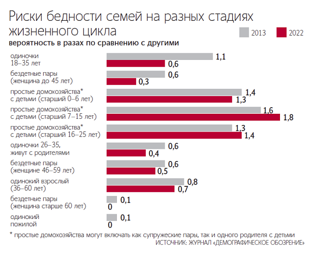 Семьи с детьми испытывают финансовые трудности в 1,3–1,8 раза чаще, чем другие россияне. Для семей с детьми младше шести лет характерен коэффициент 1,3. С началом школьного обучения нагрузка на семейный бюджет возрастает и достигает максимума. К моменту, когда старшему ребенку исполняется 16–25 лет, вероятность бедности снижается до 1,4, но по-прежнему остается выше, чем у семей без детей.