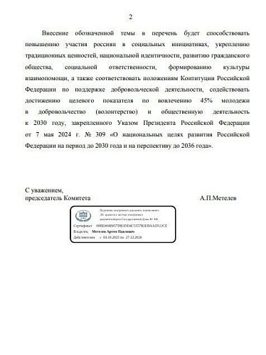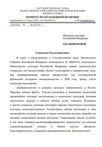Председатель комитета по молодёжной политике Государственной Думы Артём Метелев предложил включить добровольчество в перечень приоритетных тем господдержки кино на 2026 год. Обращение направлено министру культуры Ольге Любимовой.