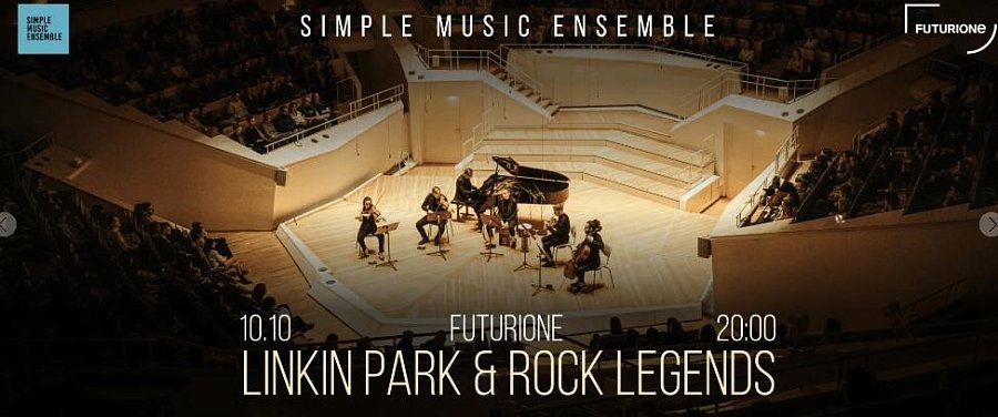 В интерактивном арт-пространстве Futurione на ВДНХ 10 октября начнется сотрудничество с коллективом Simple Music Ensemble. На концерте-открытии ансамбль представит программу «Linkin Park & Rock Legends». Благодаря уникальным аранжировкам музыка Queen, Linkin Park, Nirvana, Metallica, Rammstein и других легенд откроется по-новому.