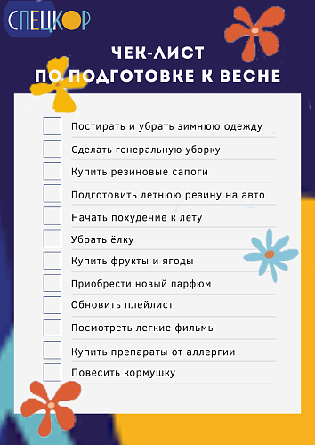 Весна полноценно вступила в свои права. Глядя на улицу, еще не скажешь, что наступил март, но мы уверены, что у вас уже пробуждается весеннее настроение! Мы подготовили для вас полезный чек-лист, который поможет окончательно попрощаться с зимним периодом и подготовиться к потеплению.